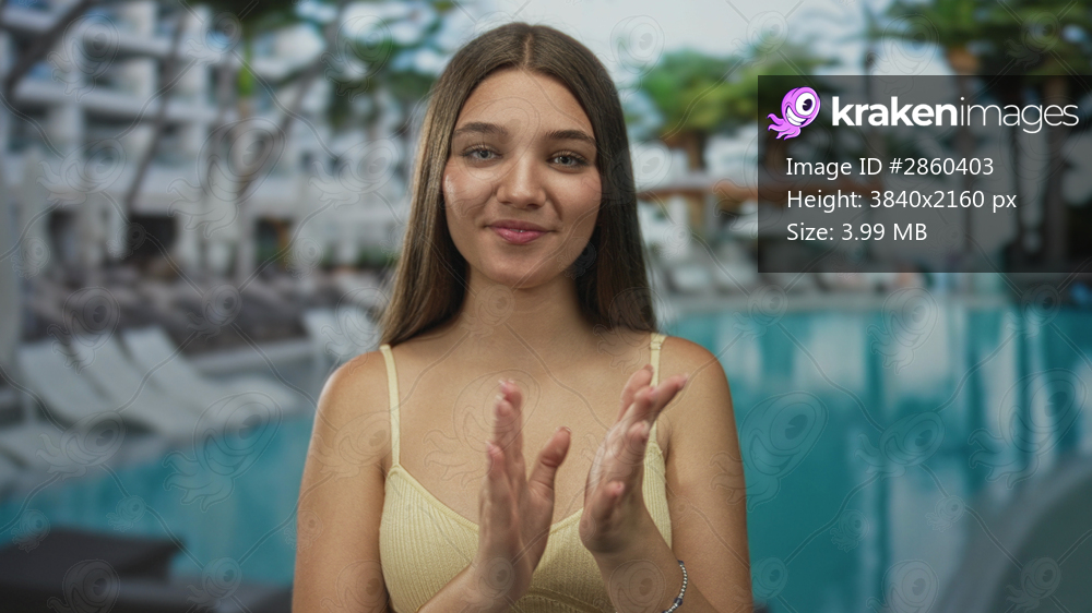 Teenage girl claps hands at sunny pool lounge near hotel building with clear water reflections and deck chairs in view; joy.