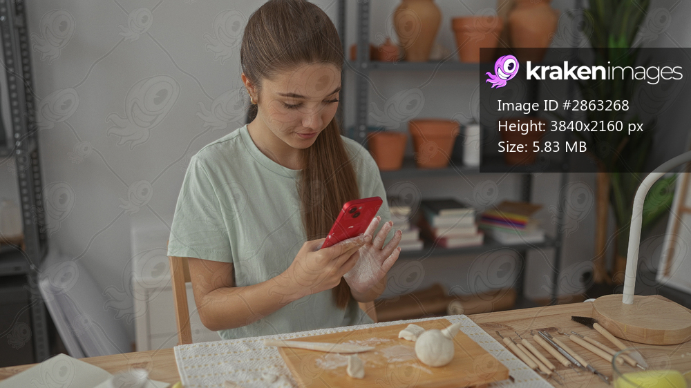 Teenage girl with clay covered hands holding a smartphone while shaping a pottery piece on a table in studio; concentration creativity.