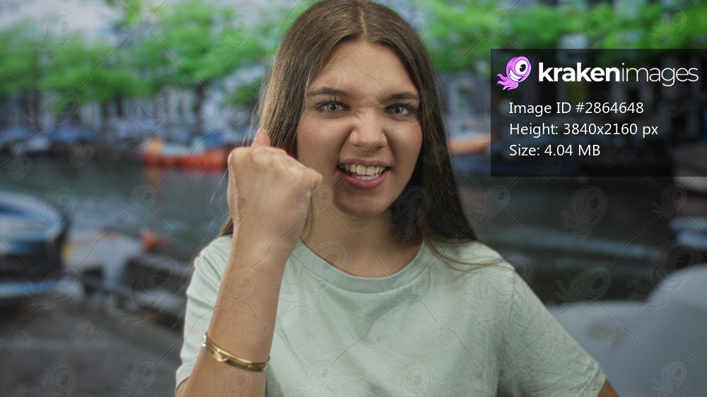 Teenage girl clenches fist by an amsterdam canal lined with historic boats and cobblestone walkway; anger.