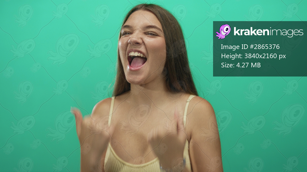 Teenage girl clenches fists while smiling broadly in mint green studio setting showcasing victory gesture; excitement triumph celebration.