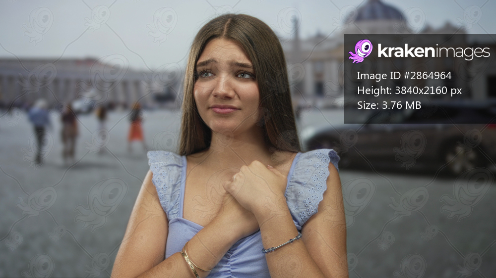 Teenage girl clutch chest on vatican street with troubled expression beneath sunlit dome of basilica; sadness.