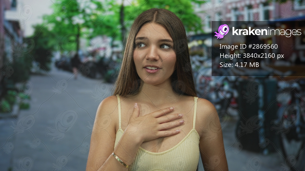 Teenage girl clutching chest on busy urban street beside parked bicycles and red brick buildings; gratitude.