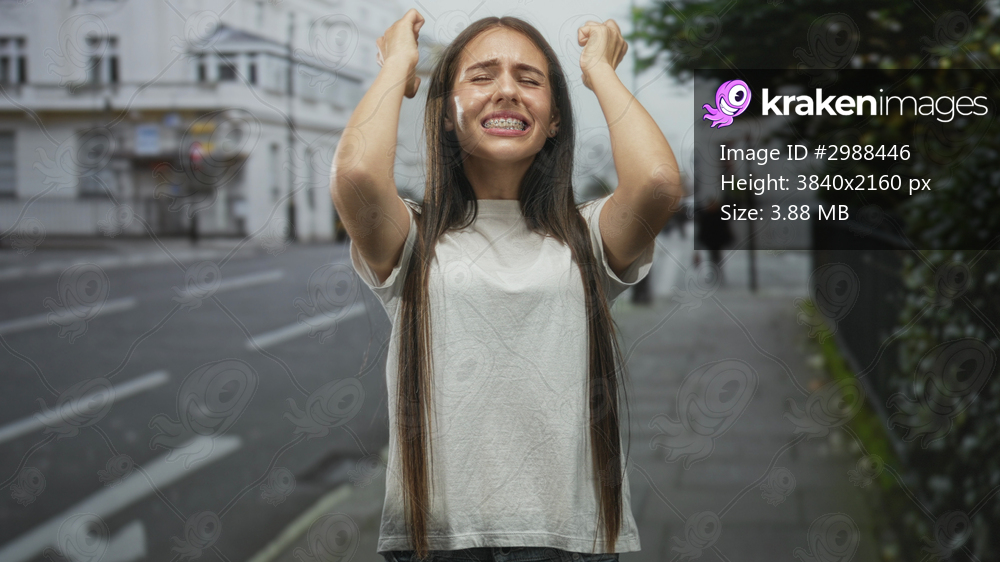Teenage girl clutching head with hands, mouth open showing braces, screaming on street beside sidewalk and building while wearing white t shirt and long hair; distress. - Kraken Images