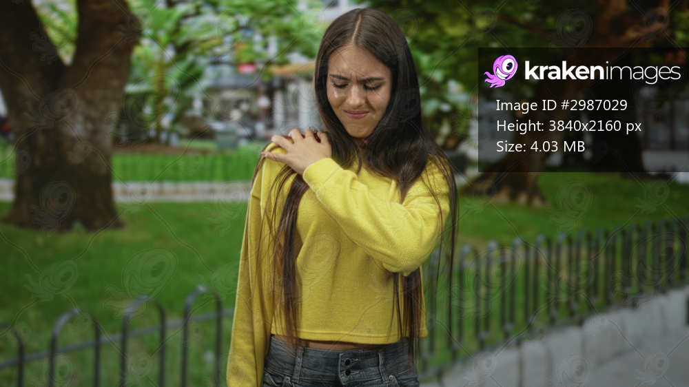 Teenage girl clutching shoulder and grimacing on street by a sidewalk and iron fence, yellow sweater and long hair visible, suggesting sudden shoulder pain; pain. - Kraken Images