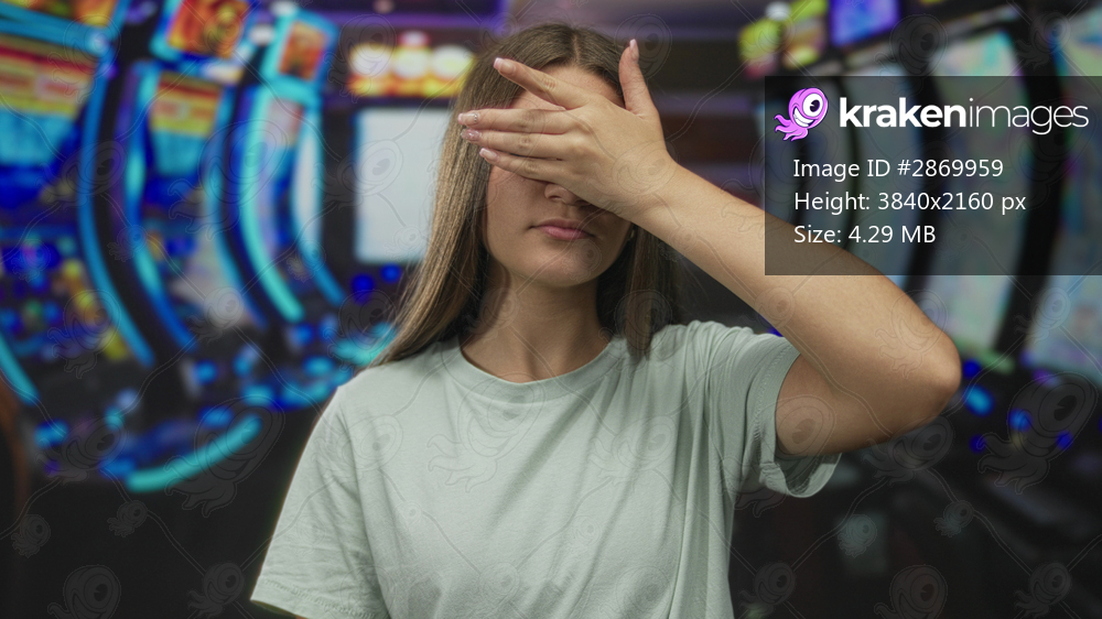 Teenage girl covers her eyes with her hand while standing at a slot machine in a casino building; anxiety.
