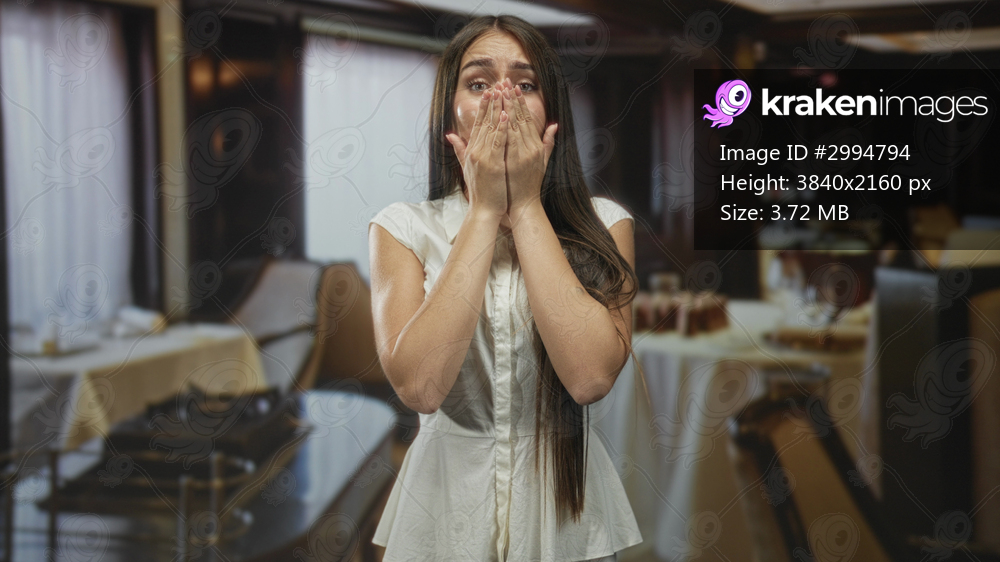 Teenage girl covers mouth with hands in a restaurant building dining area beside a table, standing in a white blouse with long hair; surprise.