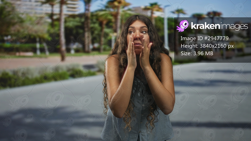 Teenage girl cupping hands to mouth shouting on a sunny street with palm trees and benches visible; alarm help.