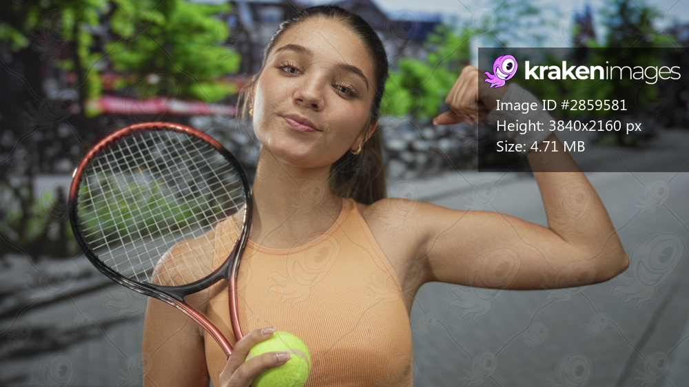 Teenage girl flexes bicep holding tennis racket and ball on street; confidence strength determination.