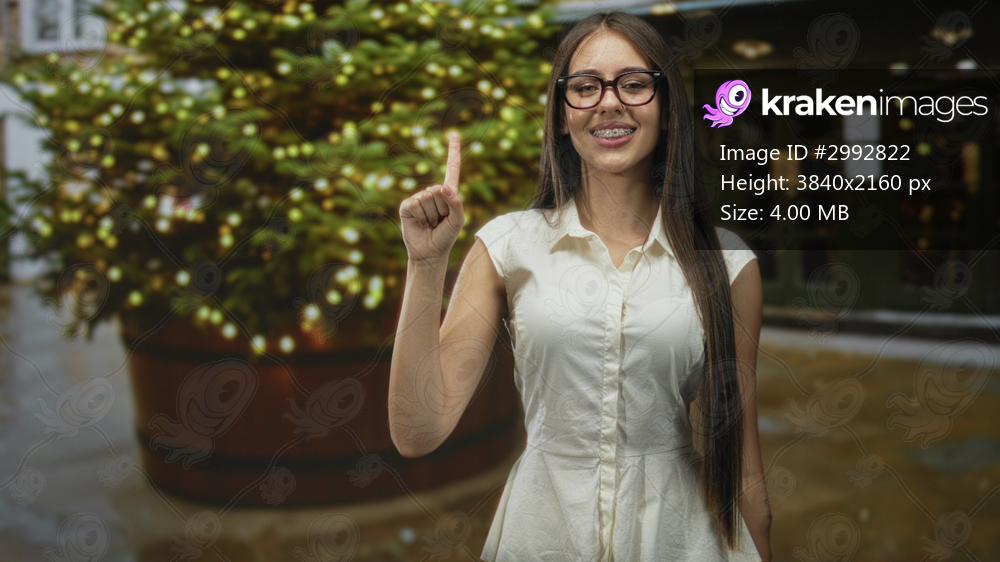 Teenage girl with glasses and braces points index finger then flashes peace sign beside a decorated christmas tree on a street; festive cheerful.
