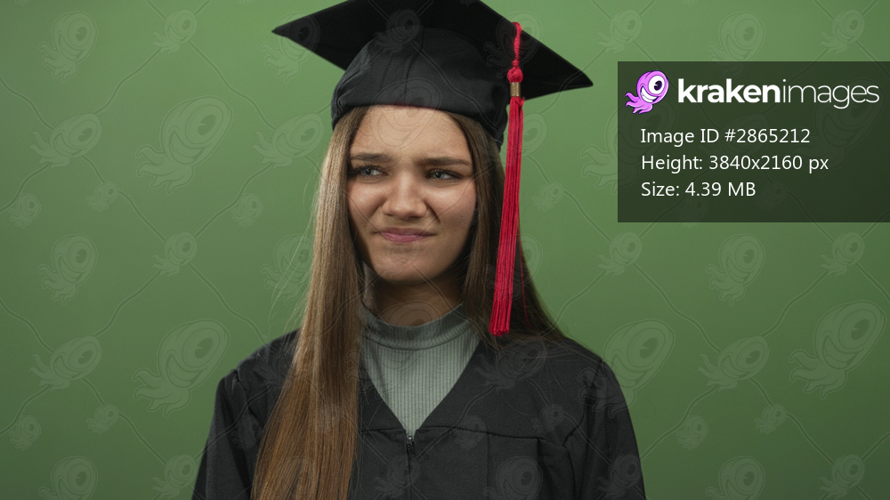 Teenage girl grimaces with scrunched nose in studio while wearing a graduation cap and gown against green backdrop; disgust.