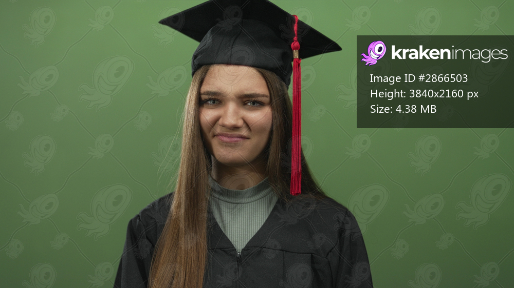 Teenage girl grimaces with scrunched nose in studio while wearing a graduation cap and gown against green backdrop; disgust.