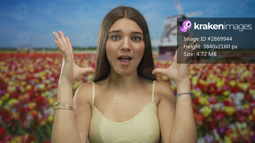 Teenage girl hands to temples, bare shoulders visible in front of a windmill building and colorful tulip field; stress contemplation.