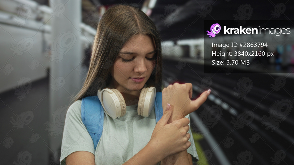 Teenage girl with headphones and backpack holds her wrist in a railway station building; concern.