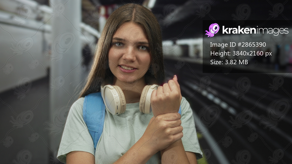 Teenage girl with headphones and backpack holds her wrist in a railway station building; concern.