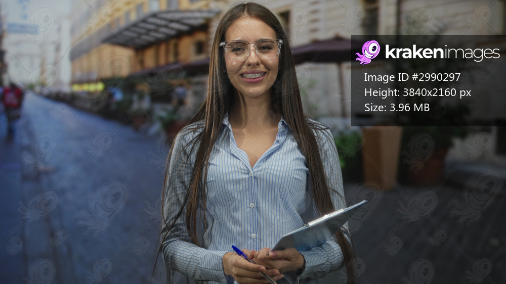 Teenage girl holding a clipboard and pen, smiling and writing while wearing glasses on a street; approachable confidence.