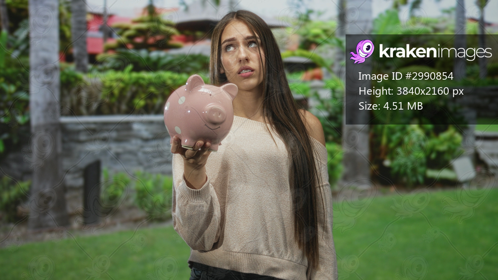 Teenage girl holding a pink polka dot piggy bank with an outstretched hand and worried expression near a landscaped stone wall by a building; financial worry. - Kraken Images