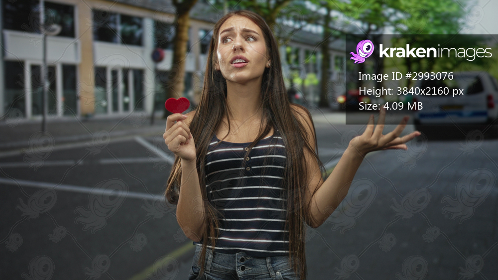 Teenage girl holding a small red heart in hand, looks up and shrugs with braces visible on a street; lost love longing.