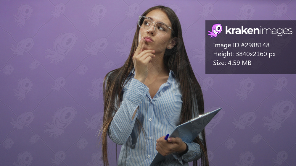 Teenage girl holding clipboard and touching finger to lips while later pointing forward in a purple studio; thoughtful decision.