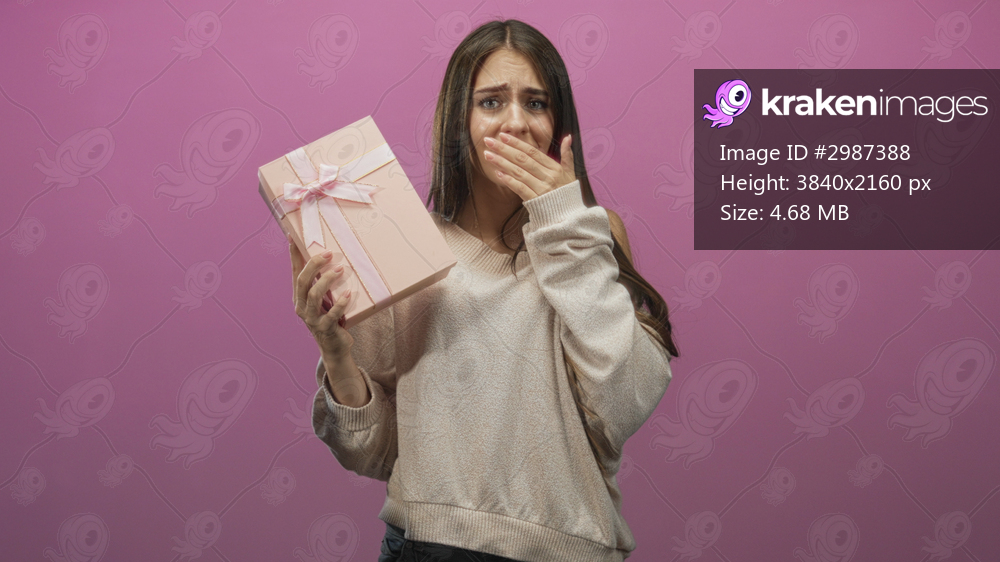 Teenage girl holding pink gift box with hand to cheek, visible braces and worried facial expression in studio; unease.