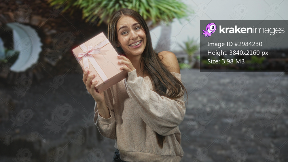 Teenage girl holding pink gift box, smiling with visible braces and tilting her head in building; joy surprise celebration.