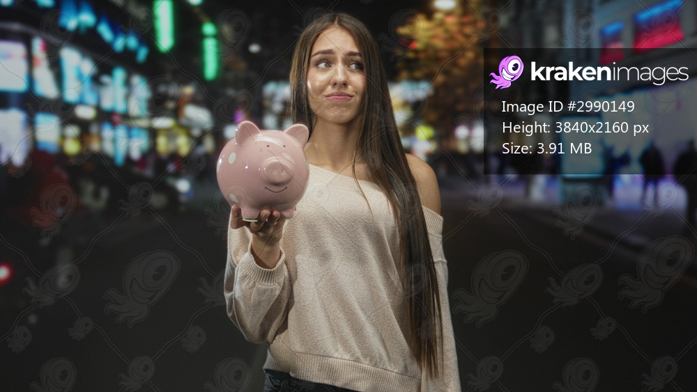 Teenage girl holding pink piggy bank with outstretched hand on a busy city street at night, uncertain expression; financial worry.