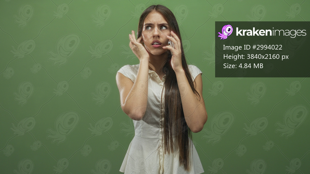 Teenage girl holding smartphone to ear, hand on cheek and visible braces in studio with green wall; panic concern.