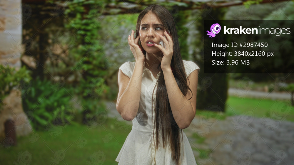 Teenage girl holding smartphone to ear, hands on cheek and grimacing in building courtyard; pain concern.