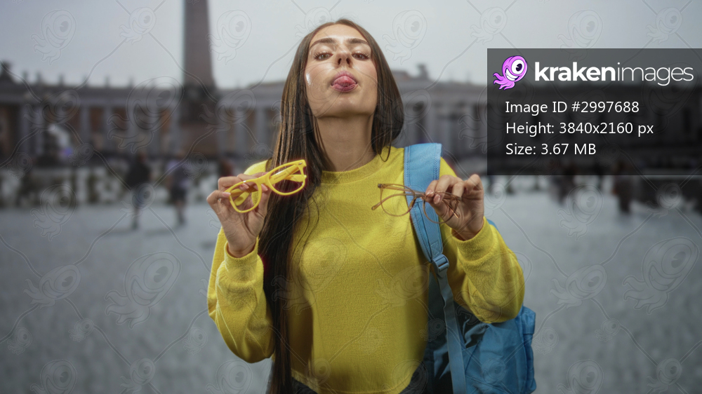 Teenage girl holding two pairs of glasses and a backpack, sticking out tongue and smiling in a historic building plaza; playful curiosity.