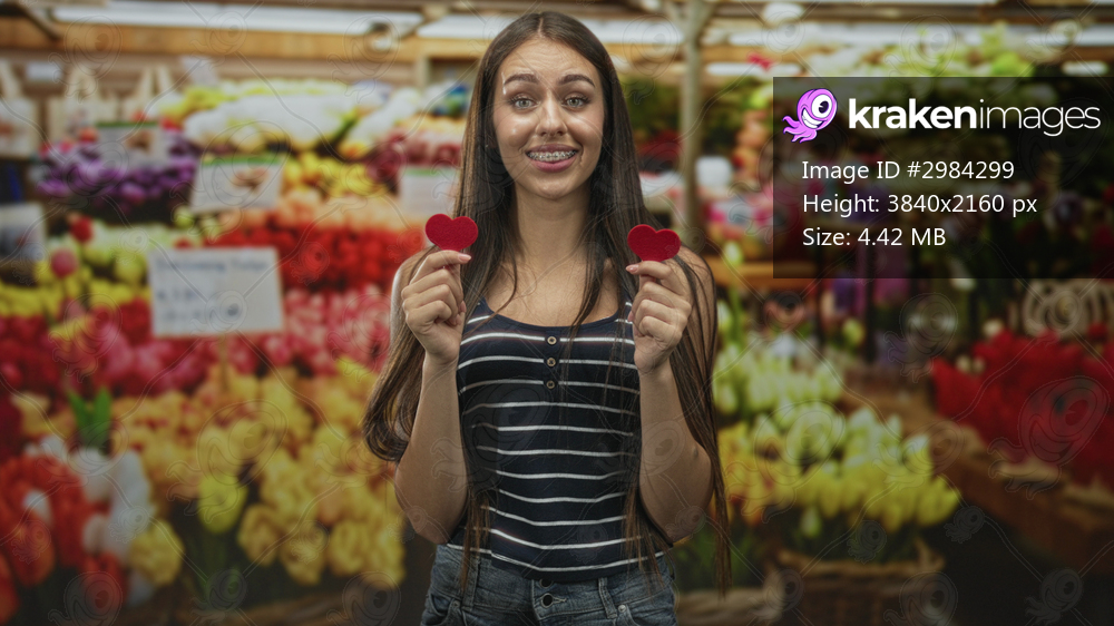 Teenage girl holding two red felt heart props with hands in a building flower market, smiling toward camera; young love joy.