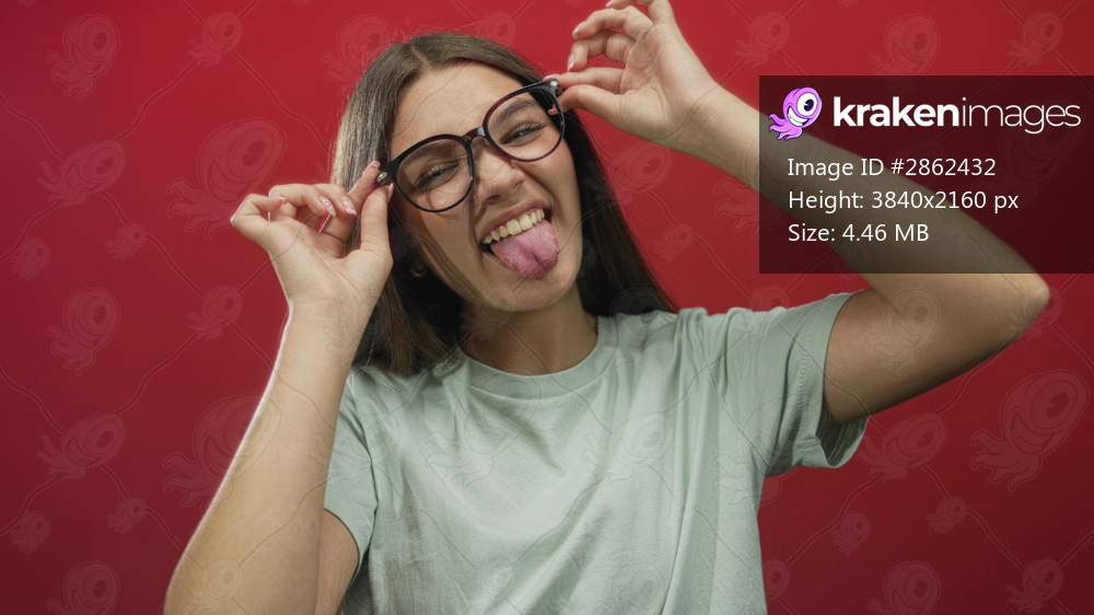 Teenage girl holds black eyeglasses by temples and adjusts frames while smiling broadly in studio; playful confidence.