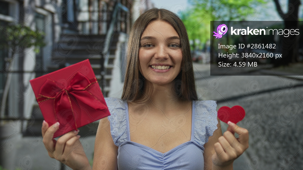 Teenage girl holds gift box and heart in hands while smiling on busy urban street under sunlight; romance joy.