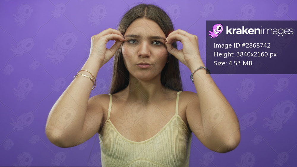 Teenage girl holds hands to temples in studio purple setting, visible forearms and bracelets showing a stress gesture; stress coping.