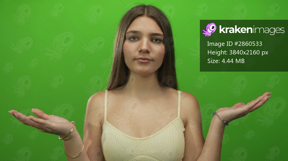 Teenage girl holds hands up in studio shrug gesture against green backdrop; uncertainty dilemma confusion hesitation.