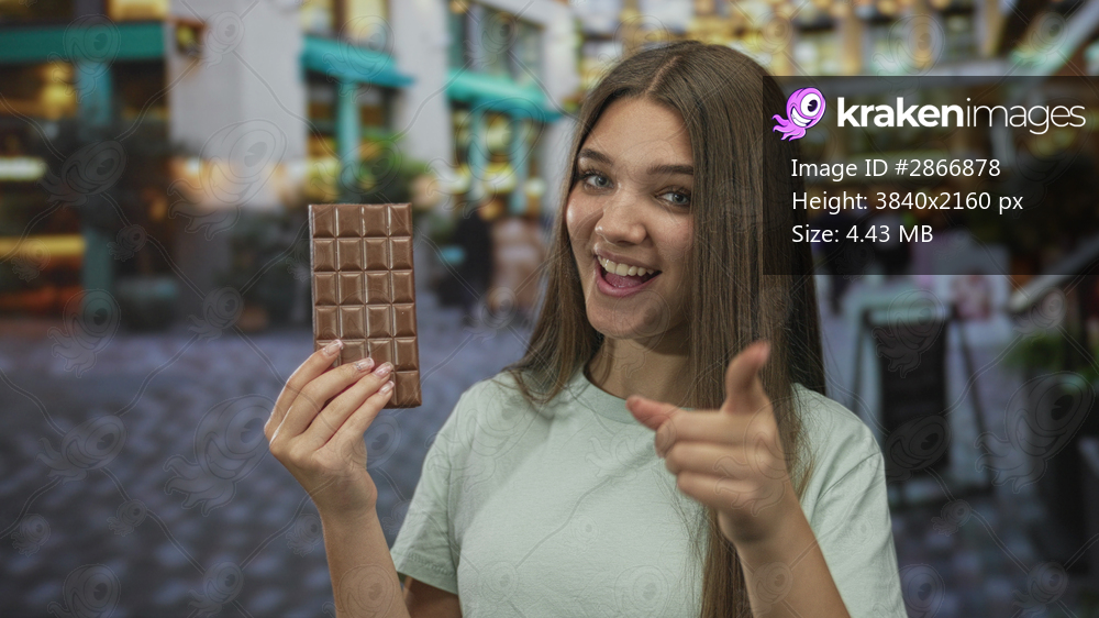 Teenage girl holds large milk chocolate bar and points finger to it on a busy outdoor street while smiling broadly; happiness.