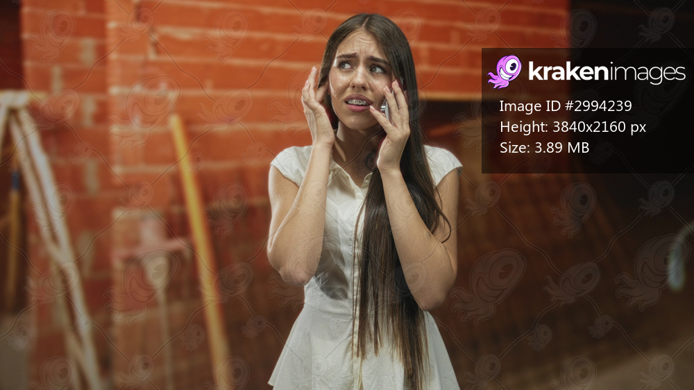 Teenage girl holds phone to ear and presses hand to cheek against brick building wall; anxiety urgency.