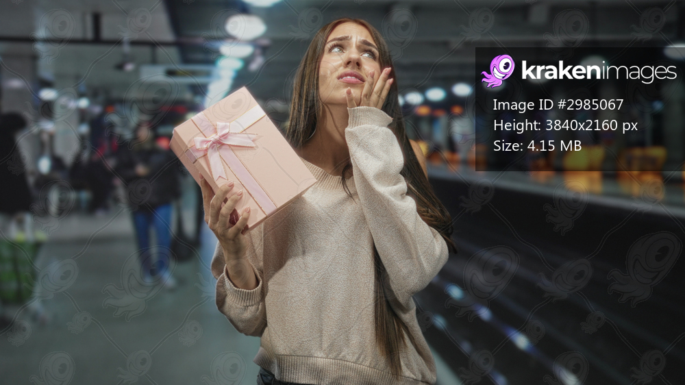 Teenage girl holds pink gift box, hand to cheek, grimacing on a subway platform inside a building; anxiety disappointment.