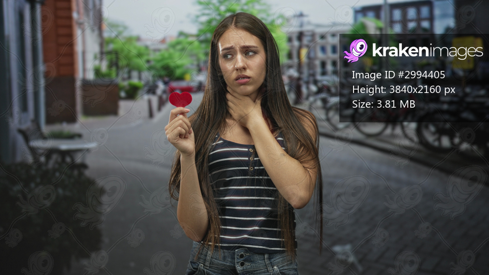 Teenage girl holds small red heart and clutches her throat while standing on a city street with parked bicycles and buildings; heartbreak.