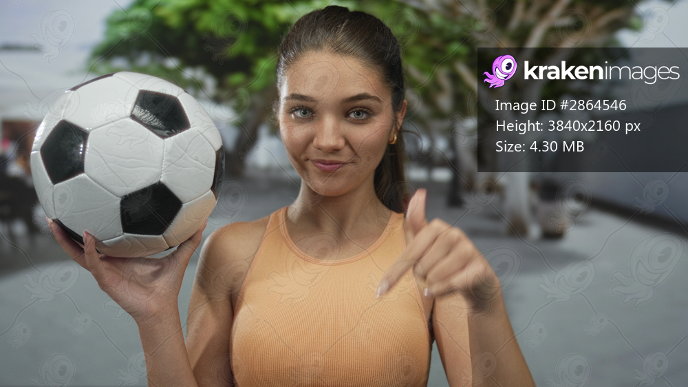 Teenage girl holds soccer ball on sunlit street outdoors smiling and pointing finger down; confidence.