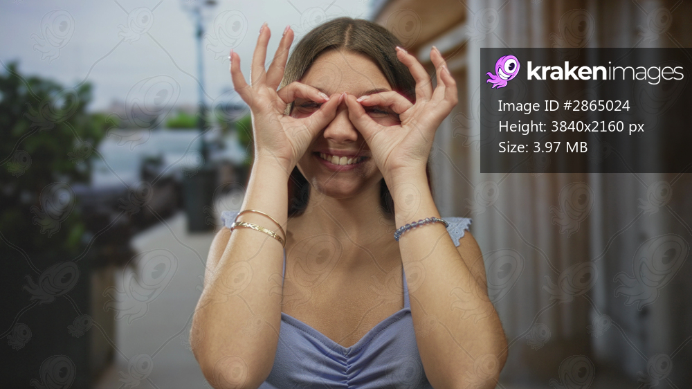 Teenage girl in a light blue top makes a binocular gesture with her hands around her eyes on a street; playfulness.