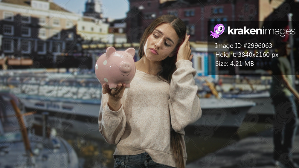 Teenage girl in beige sweater holds pink polka dot piggy bank out with one hand while pressing her forehead with the other in a studio; financial worry. - Kraken Images