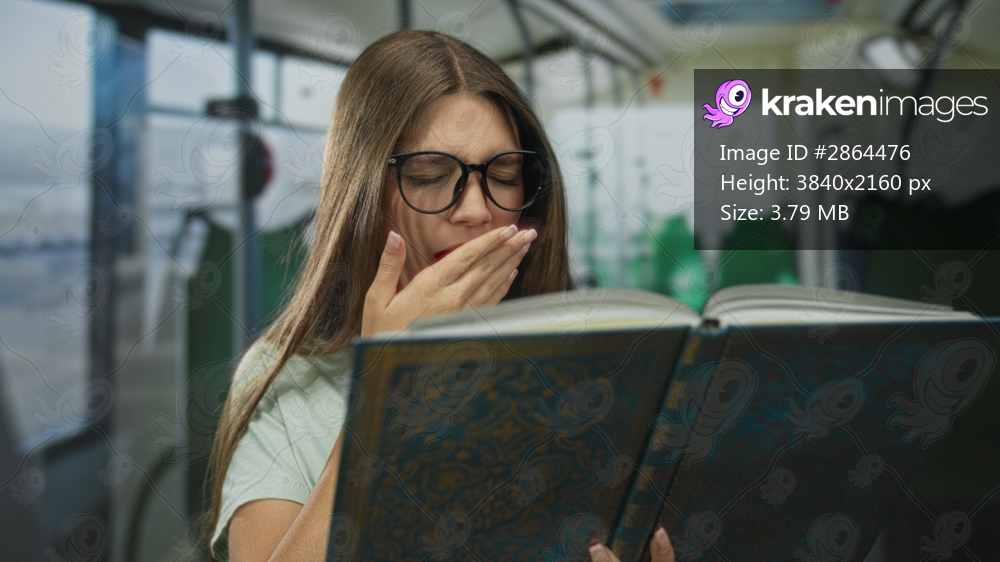 Teenage girl in glasses holds a book but covers her mouth in a yawning gesture on a street bus; fatigue.