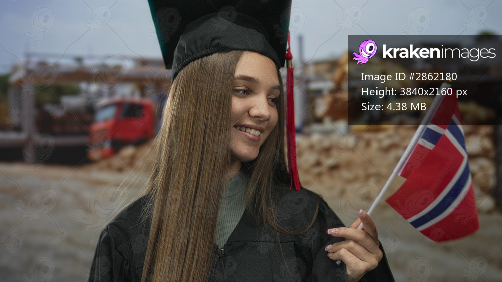Teenage girl in graduation gown holds norwegian flag at a building site with a construction crane in view; pride celebration.