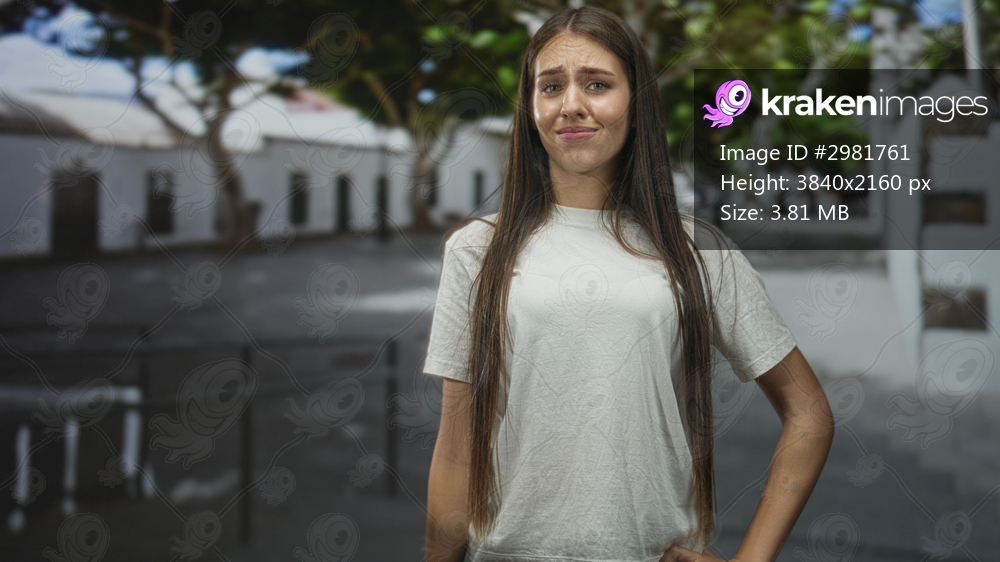 Teenage girl in white tee with hand on hip and uneasy grimace, eyes closed against sunlight on a narrow street with white buildings; awkwardness.