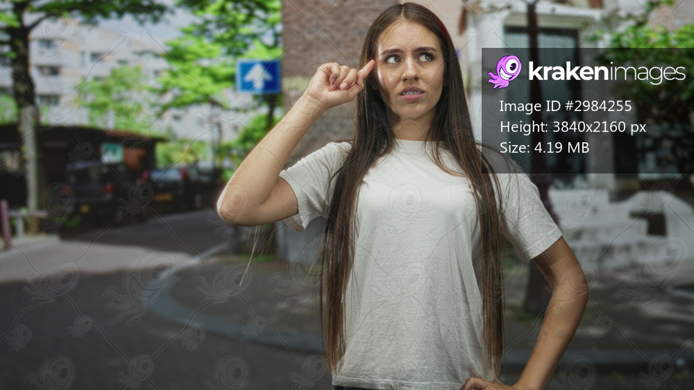 Teenage girl in white tshirt points index finger upward on a street by a brick building; confusion signals.