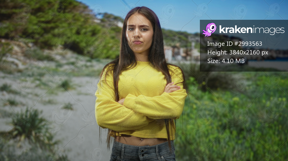 Teenage girl in yellow sweater with arms crossed showing exposed navel and pouty face on a sandy beach; stubborn defiance.