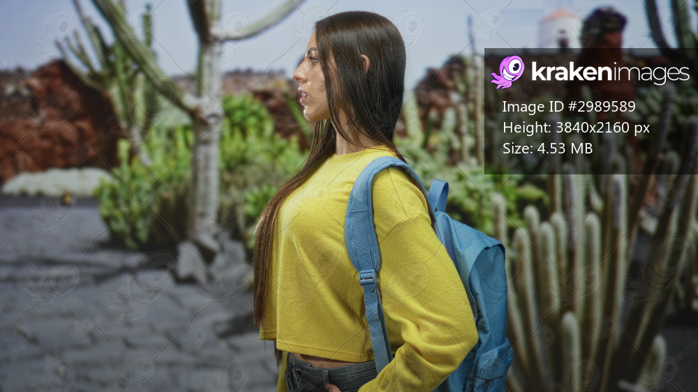 Teenage girl in yellow sweater with blue backpack poses with hand on hip facing camera in studio; confidence youthful travel.