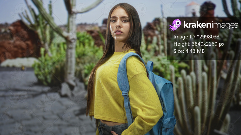Teenage girl in yellow sweater with blue backpack poses with hand on hip facing camera in studio; confidence youthful travel.