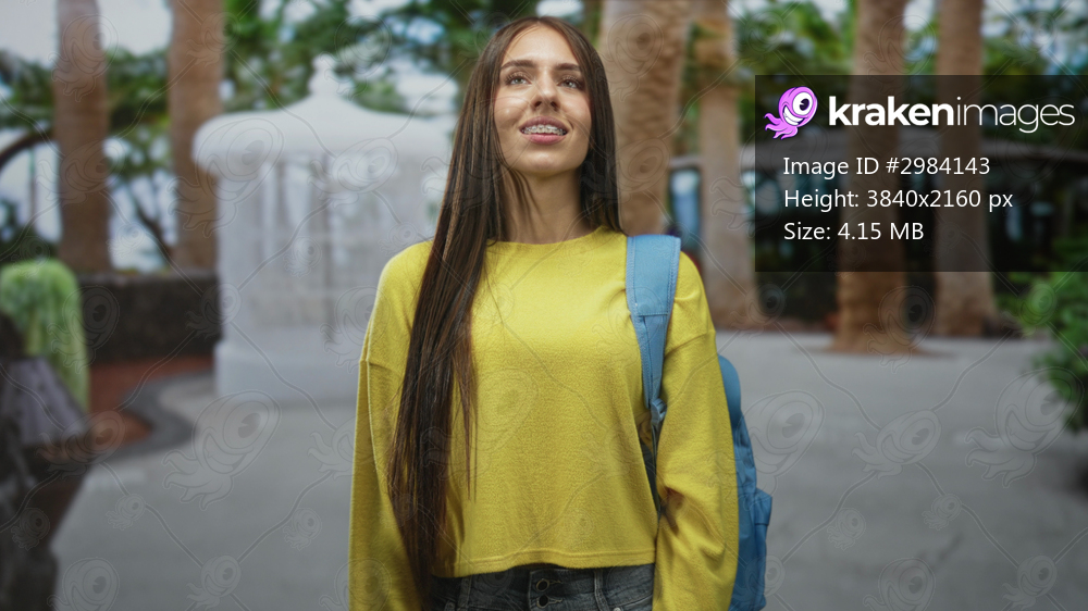 Teenage girl in yellow sweater with blue backpack standing with head tilt and subtle smile in park; youthful optimism.