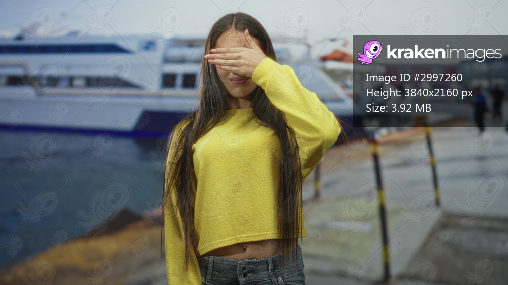 Teenage girl in yellow sweater covering eyes with right hand at harbor pier by a ferry and bollard posts, later revealing face and raising arm; shyness. - Kraken Images