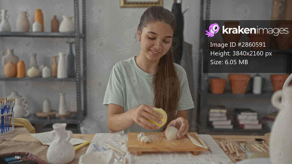 Teenage girl kneads clay with both hands in studio surrounded by ceramic vessels; creative focus mindful practice.